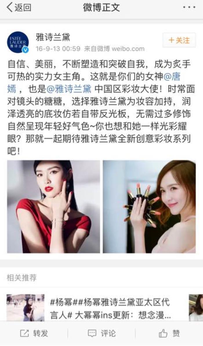 才发现唐嫣短短一年竟然换了4家化妆品公司,而且官宣的都非常接近,去年9月雅诗兰黛大使,今年2月fresh大使,再到5月珀莱雅代言人,最后8月资生堂彩妆代言人,是不是很厉害