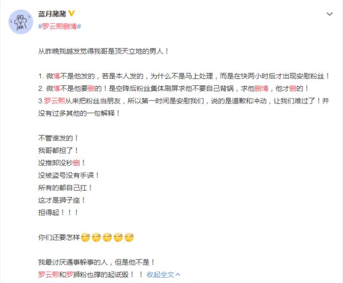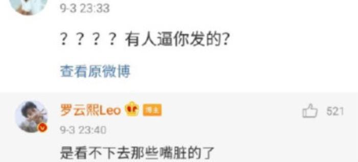 昨天半夜,罗云熙更博:“道听途说加上无中生有的脑补就只是笑话而已 这一瓜 送给那些挑拨离间乱带节奏的 想变成蜂窝煤吗 可以来试试 被带跑偏的可以选择把队伍站回来 站对了 这就是送给你的痒痒挠”。看来这是罗云熙针对最近团队核心人员变动的谣言给以否认,不过后来微博很快就删了,接下来就有粉丝质疑微博不是罗云熙本人所发,而是其“幕后黑手”——工作人员所为。他们坚信罗云熙不会说出那样的话,可能被“绑架”了。