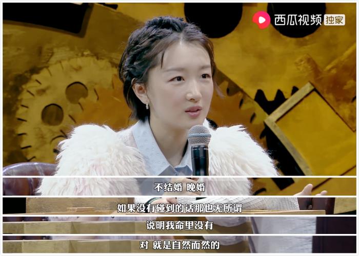 周冬雨说,她能接受晚婚甚至不婚:“如果没有碰到的话那也无所谓,说明我命里没有。”