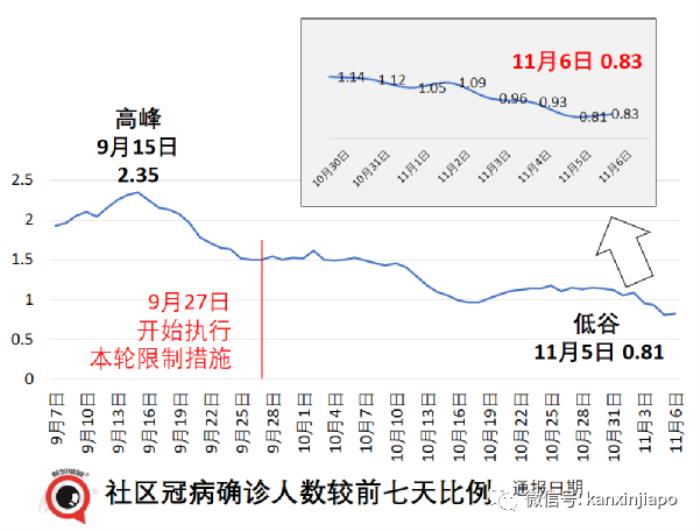 根据卫生部11月6日通报,新加坡社区病例的前七天确诊人数比例,相对再前七天是0.83,意即前一阶段每出现100起,现阶段就出现83起,感染圈看似在缩小。