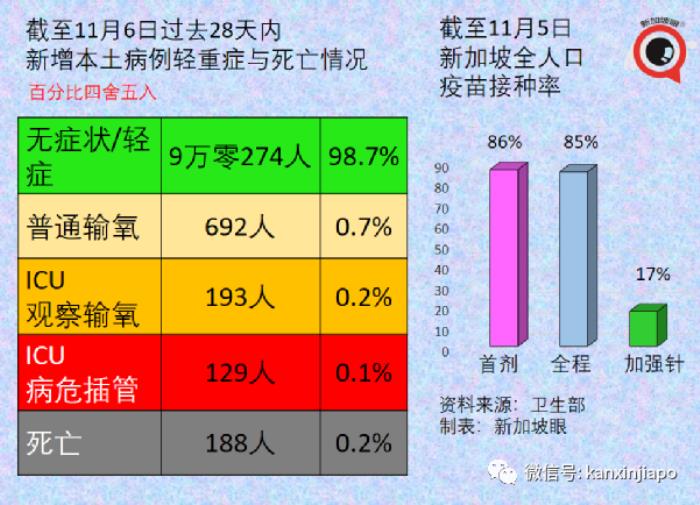 新加坡卫生部通报,截至11月5日,已接种至少一剂疫苗的,升至总人口的86%;85%已完成疫苗全程接种,17%已接种加强针。这里指的是全人口比例,包括未满12岁儿童。