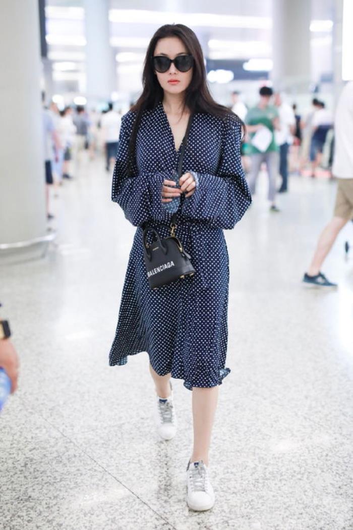 波点连衣裙伴随着复古风袭来也开始受到了大家的关注,像这一次的张馨予就选择了一条波点连衣裙,上面的波点元素还非常的细密,很俏皮也很可爱,藏蓝色为底色极其显瘦,相比普通的黑色来说更加个性时髦,胸前结合v领的剪裁能够很好地修饰脸型,圆脸女孩子可以尝试一下。