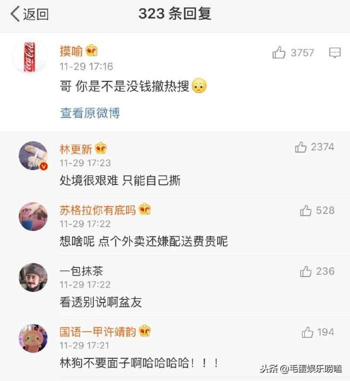 在此之前发表回应的俞灏明、蒋梦婕纷纷发文道歉,战火很快就从他们身上引到了林更新处。他发表的4字回应彻底爆发了心中的OS,我怎么了?就感慨一下7年过的很快,作为当时一起参演这部戏的演员,他们也合作过,就这样被带领到了道德高地上。不过画风转化很快,本来严肃措辞的道歉文到林狗这里瞬间笑点漫步,网友们纷纷点评道是不是没钱撤热搜,得自我一条龙服务亲自上阵了。画风清奇的林更新一下子就带偏了方向,带领我们走向视觉的欢乐,有一种明星就是有这种减压的魔力。