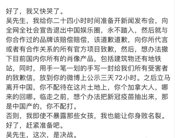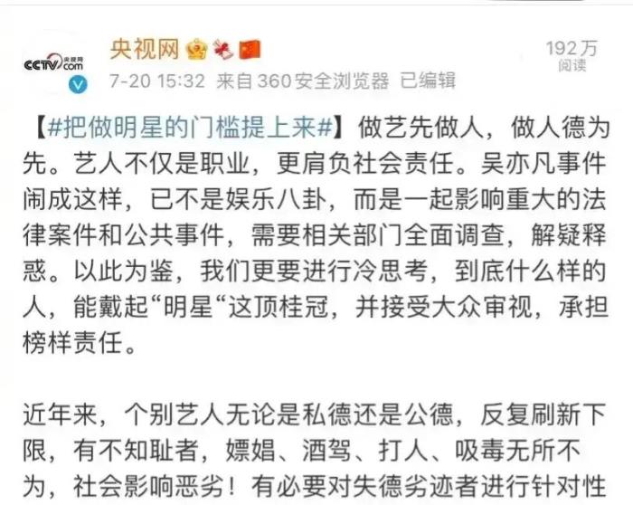就是这一篇文,激发了全部网民的愤怒,女性看了会对都美竹共情,男性看了会对吴亦凡不齿,也在一天之内引得二十多名女生站出来的曝光吴亦凡,那一天吴亦凡几乎是被“一锤定音”,官媒开始逐渐下场批评,随后业内流传出了封杀的红头文件。