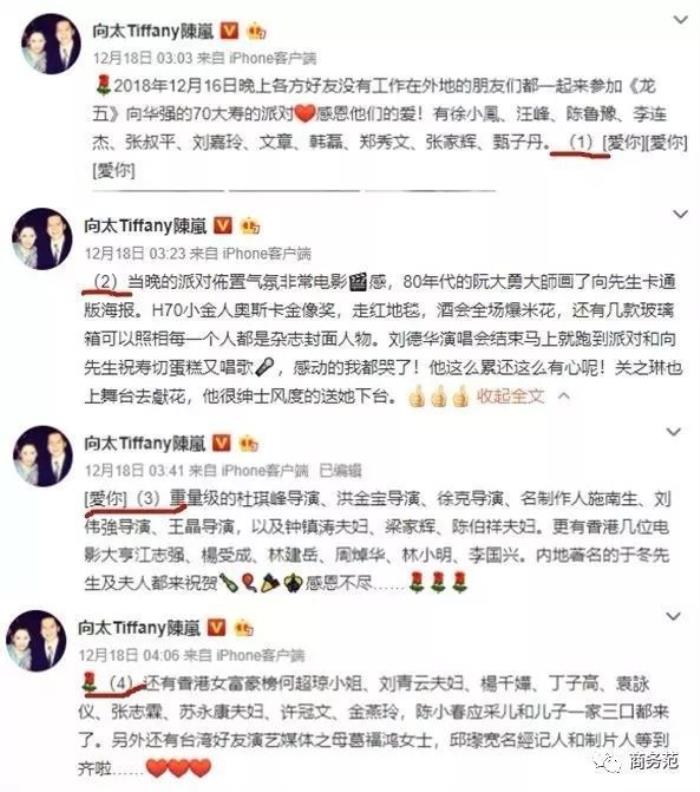 商界、娱乐圈很多名人明星都齐聚香港,一同给向华强过生日。其中,光是向太微博公布的重要嘉宾名单,就有4条之多↓