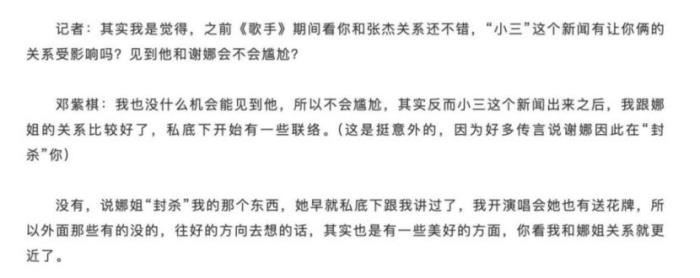 同在歌坛,而且参加了同一个综艺节目,张杰和邓紫棋的交集还是很多的,有一份好友之间惺惺相惜的感情,才能一起学邓紫棋标志性的金鱼嘴合拍。“小三”爆料发酵后,谢娜的好友李小冉看不下去,驳斥是“假新闻”,但也因为这综绯闻邓紫棋和谢娜的关系更近了一步,私下开始有一些联络。