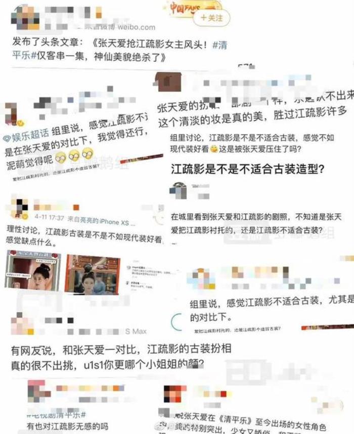 据悉,江疏影的经纪人朋友圈发文Diss张天爱团队,直指对方找水军发文暗讽江疏影古装造型不如张天爱。