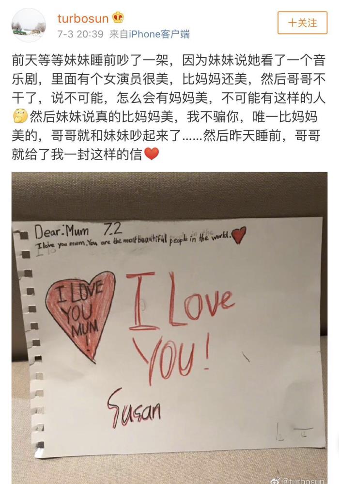 3日晚,孙俪@turbosun 曝光了一双儿女吵架的趣事。原来是小花妹妹夸一个音乐剧女演员“比妈妈还要美”,不料引发了等等的不满,抗议称不可能有比妈妈还美的人,兄妹俩为此吵了起来。第二天等等还特地写信表白孙俪,“妈妈是这世界上最漂亮的人”。