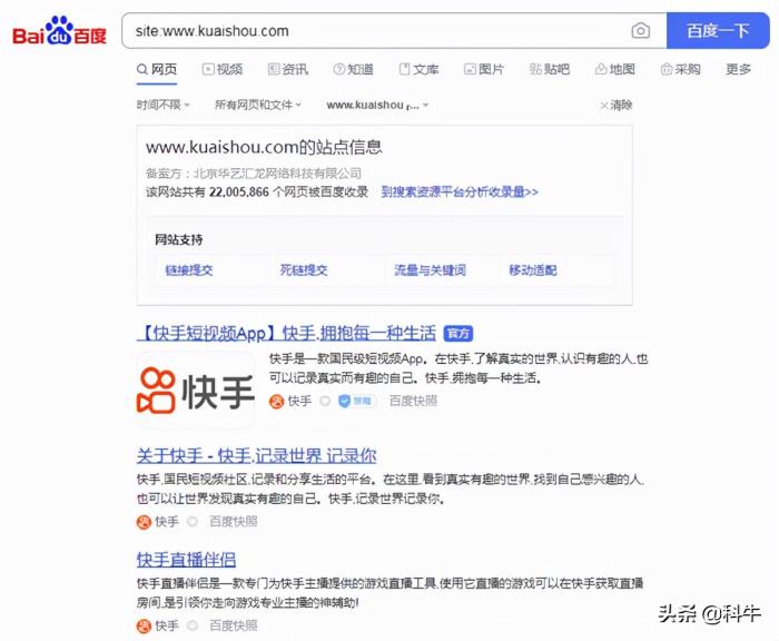 通过site指令可以看到,抖音目前的百度收录量达到了1亿6800万个页面,而快手略少,也有2200万个。