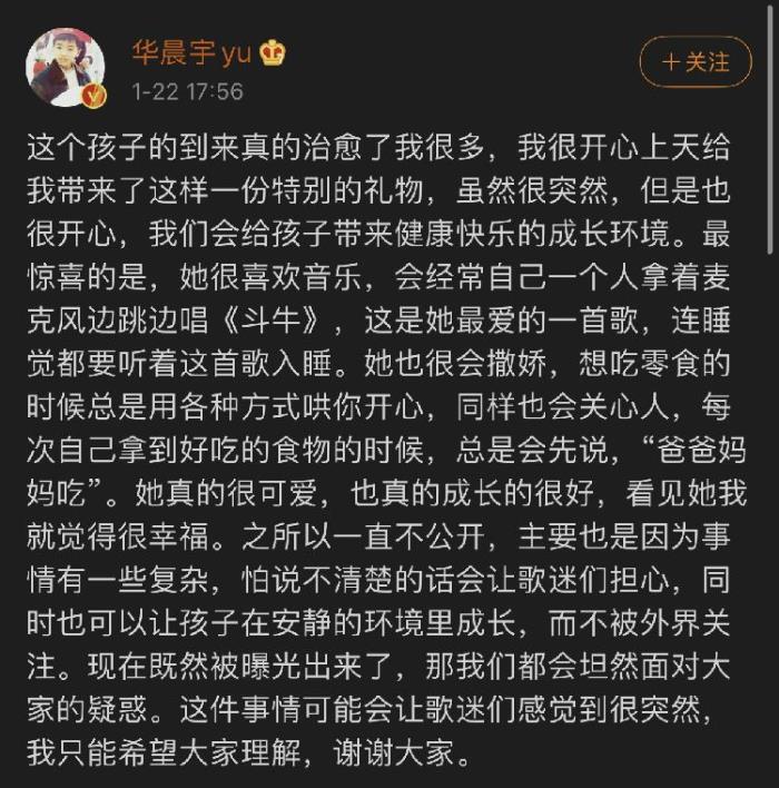 晚上6点左右,华晨宇也在自己的微博上发出了一段长文,其中有不少措辞在粉丝们看来似乎另有深意。“这个孩子的到来真的治愈了我很多,我很开心上天给我带来了这样一份特别的礼物,虽然很突然,但是也很开心,我们会给孩子带来健康快乐的成长环境。”