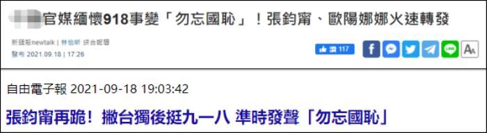 (观察者网讯)今年是九一八事变爆发90周年。昨日(9月18日),中国台湾艺人欧阳娜娜、张钧甯、王大陆于零时后陆续转发@人民日报、@央视新闻关于“勿忘国耻”的微博,此举受到大陆网友好评,被赞“三观正”。然而台湾地区部分绿媒看到后,又开始酸了。