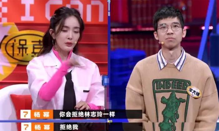 顿时,杨幂的表情露出一丝尴尬,似笑非笑,然后接到“甜美的”……意思是说男选手喜欢甜美类型的。还追问到“你会拒绝林志玲一样拒绝我吗”?