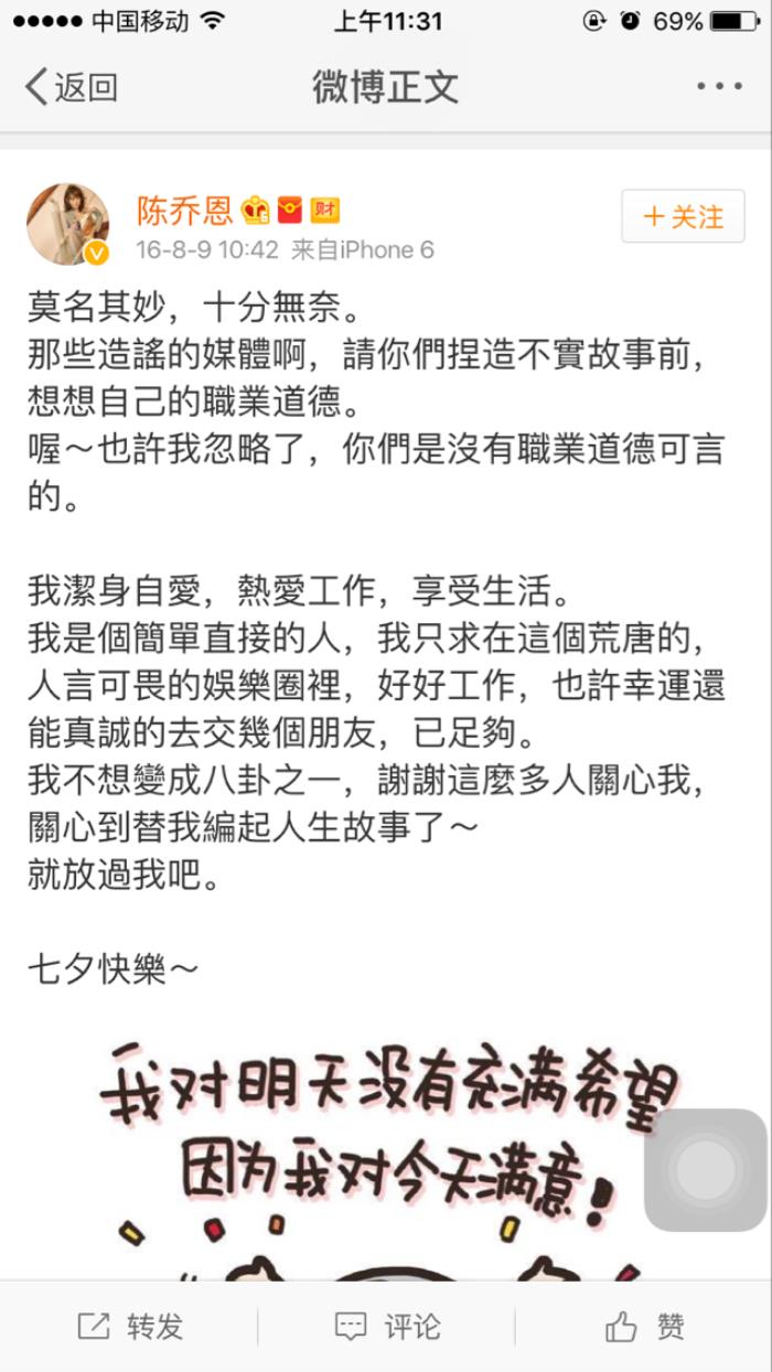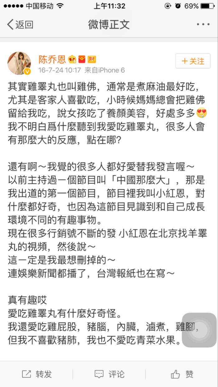 仍然记得,此事之前,陈乔恩还因早年参加综艺节目说自己喜欢吃鸡睾丸一事被媒体乱写、网友乱评,而在网上大发雷霆。