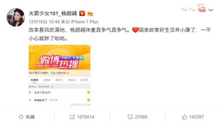 在她本人发现自己上因为胖上热搜后,杨超越发文表示之所以胖了这么多,都是因为现在的国家政策好了生活奔小康了,一不小心就胖了这么多。虽然我们的超越胖了但是还是非常的可爱啊,情商也是非常的高,这样的杨超越你喜欢吗?
