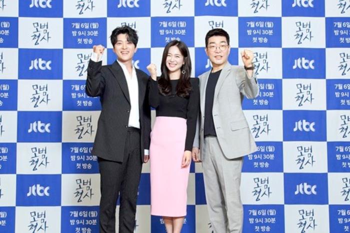 7月6日 下午,孙贤周等韩国艺人在首尔出席了JTBC电视剧《模范刑警》的发布会。
