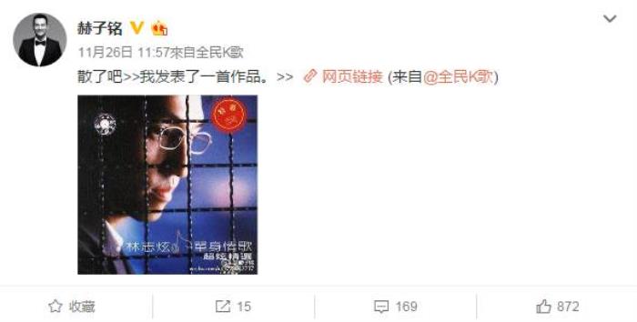 再看赫子铭的微博,除了有一条关于何洁演唱会的微博,剩下的都是颇有深意的微博画风“感恩曾经在我身上发生的一切”“散了吧”还配上了一首单身情歌
