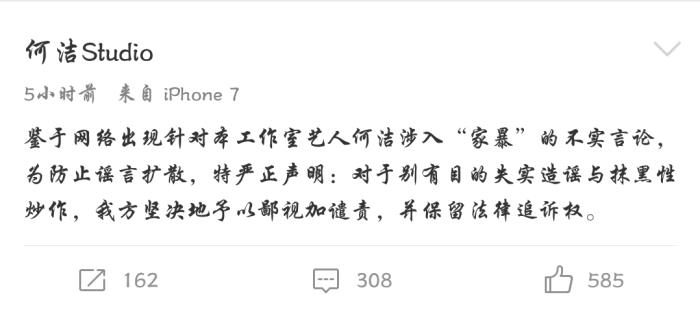 而且今日何洁工作室也对此事作出了回应称樊昊仑所说的家暴是不实言论,并保留法律追诉权“鉴于网络出现针对本工作室艺人何洁涉入“家暴”的不实言论,为防止谣言扩散,特严正声明:对于别有目的失实造谣与抹黑性炒作,我方坚决地予以鄙视加谴责,并保留法律追诉权。 ”