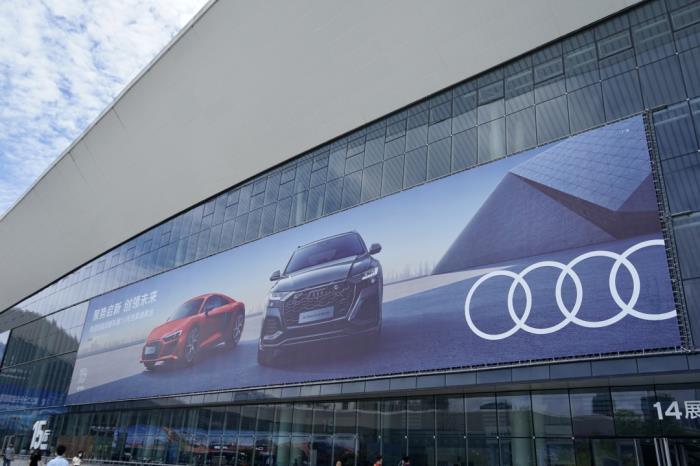 绝对主打的色彩,整个奥迪展台内,主视觉,包括工作人员的着装,都是同样的凯莫拉灰,有一种进了秀场的感觉。今年的流行色,我先大胆预测一个凯莫拉灰。