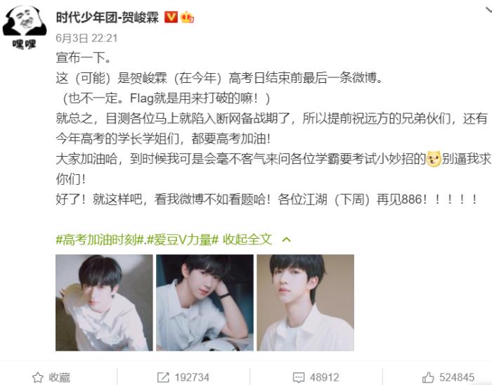 早在6月3日,贺峻霖就发了高考前的最后一条微博,要全力备考了。马嘉祺最近的一条微博是5月28日发布的,他更加专心备考。丁程鑫最后一条微博也是5月28日,这么一对比,反而显得贺峻霖有点不专心了。