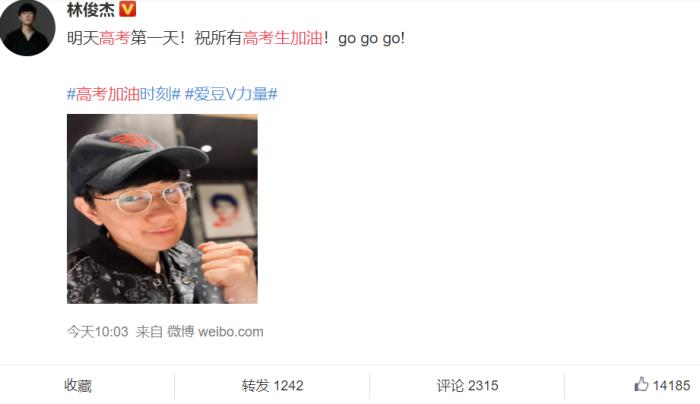 序言:2021年的高考明天就要开始了,很多明星在微博上为考生加油打气。林俊杰在微博发文:“明天高考第一天!祝所有高考生加油!go go go!”