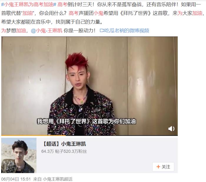 王琳凯也录了一个视频为高考学子加油,但王琳凯有为自己新歌炒作的嫌疑。不过话又说回来,即使是炒作,这还是正能量的体现,毕竟王琳凯的粉丝喜欢他唱歌。