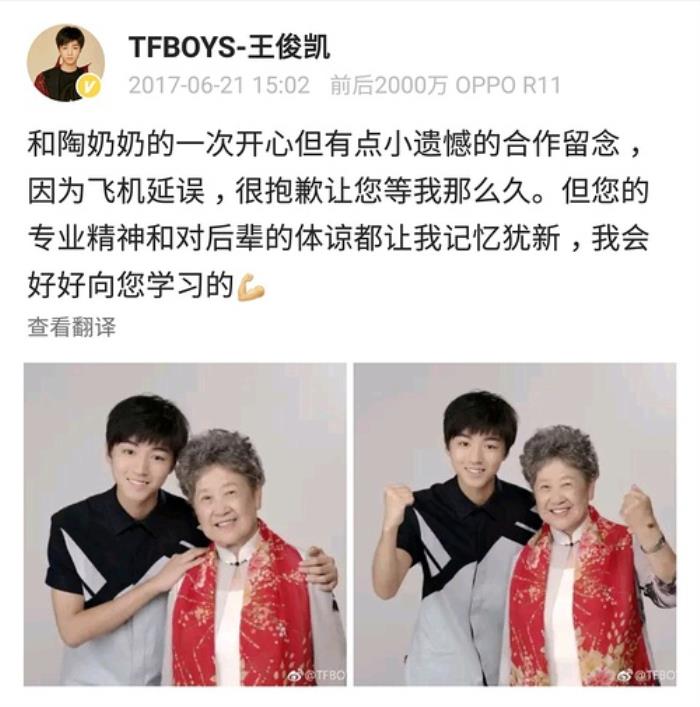 至于老奶奶语气开玩笑得说每次都我等你啊。其实王俊凯和老奶奶接触就过两次,第一次因为航班延误去晚了,还专门发了微博道歉。第二次就是这次,如果真的和老奶奶约好时间去晚了,那无话可说是王俊凯的错。但是也有可能老奶奶来的早一些,就好比这个会四点开,有人三点半到了有人三点四十五到了,三点半的人说我等你了啊。