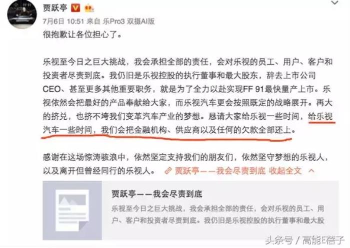 7月6日,贾跃亭在微博表示自己将会通过“乐视汽车”把大家的欠款还上。