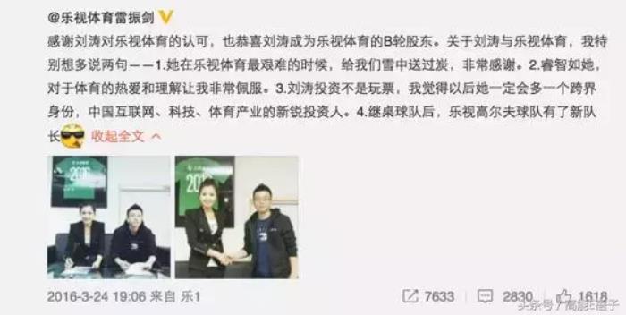 刘涛2016年3月成为乐视股东,乐视ceo雷振剑发微博盖章。