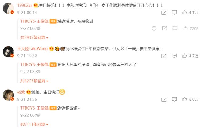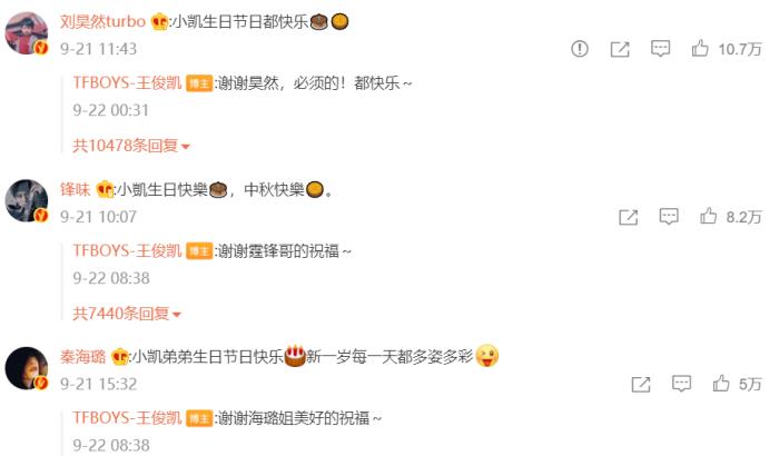 刘昊然、王大陆也在王俊凯的生日贺卡下面留言为其庆生,刘昊然和王俊凯合作了《高能少年团》第一季,以及《恰好是少年》;王大陆则和王俊凯合作了《高能少年团》第一季和第二季。《高能少年团》的常驻嘉宾中,只有张一山没有为王俊凯庆生。