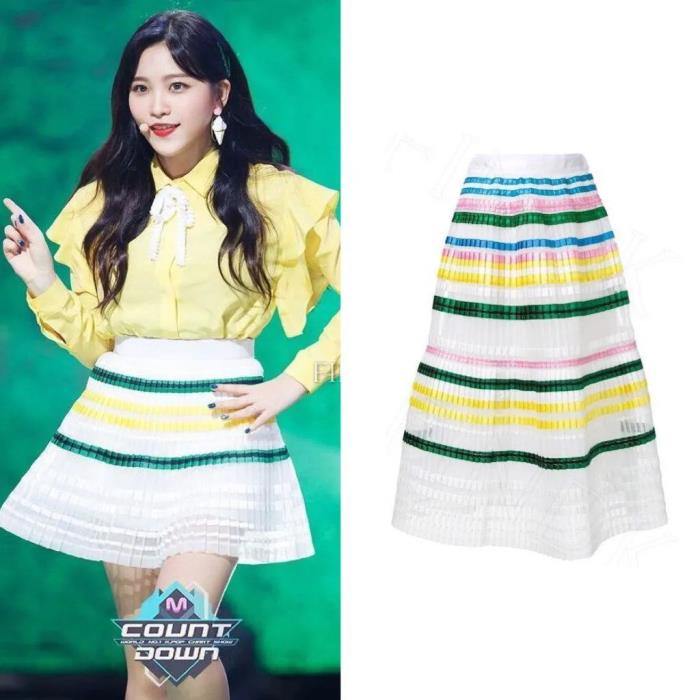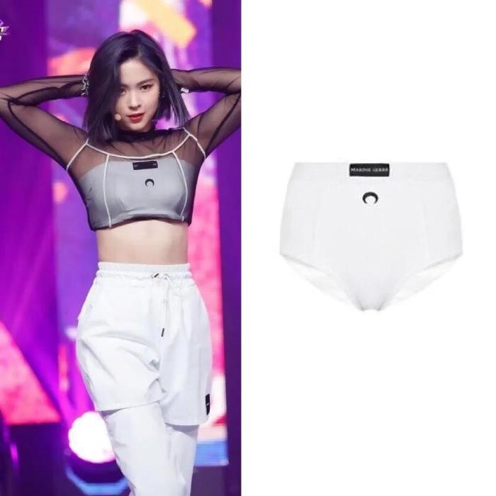 下面这位就更厉害了——JYP新女团Itzy的成员申留真,这件在打歌舞台上穿的抹胸胸衣其实是用Marine Serre的内裤改的。