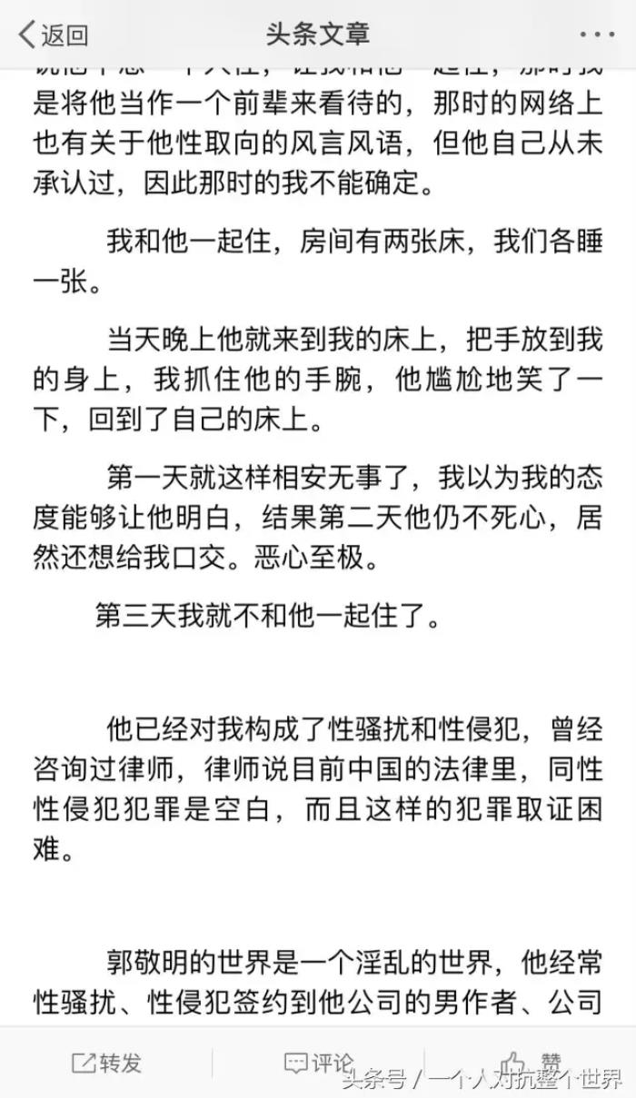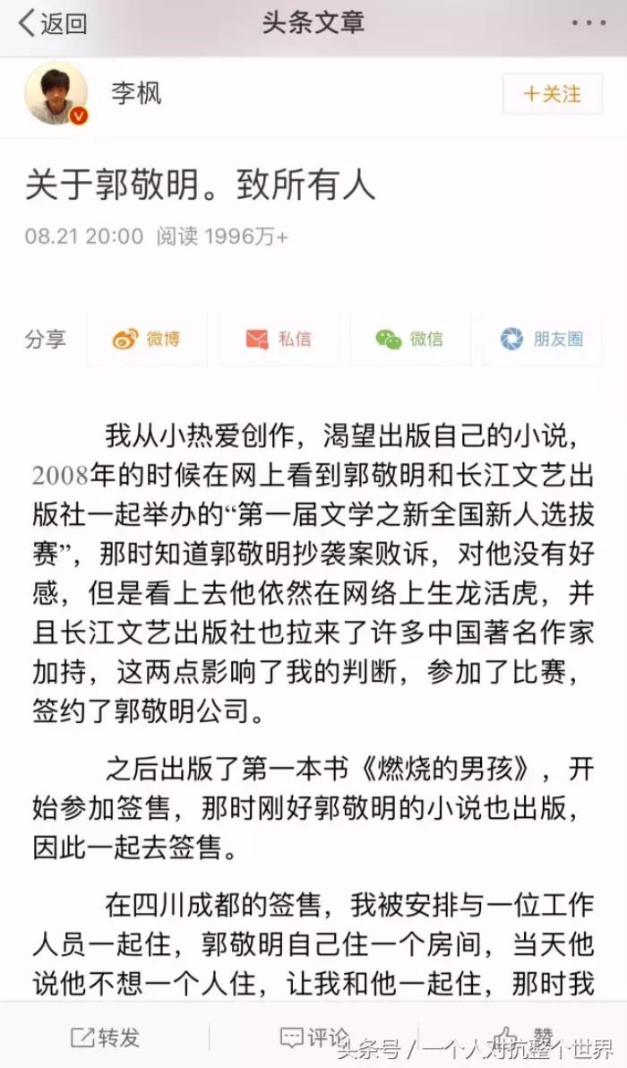 而这两天,最大的一个重磅猛料莫过于李枫突然发声征讨郭敬明,称其曾性侵自己,以下为李枫原文