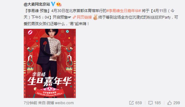 爱豆新闻讯 朋友们!紧张的时刻到了!4月30日在北京首都体育馆举行的李易峰生日嘉年华将于4月11日(今天)下午5:04开启预售,能不能和峰峰一起过生日就看大家的手速啦!