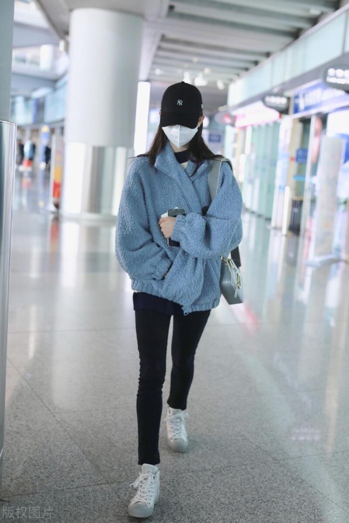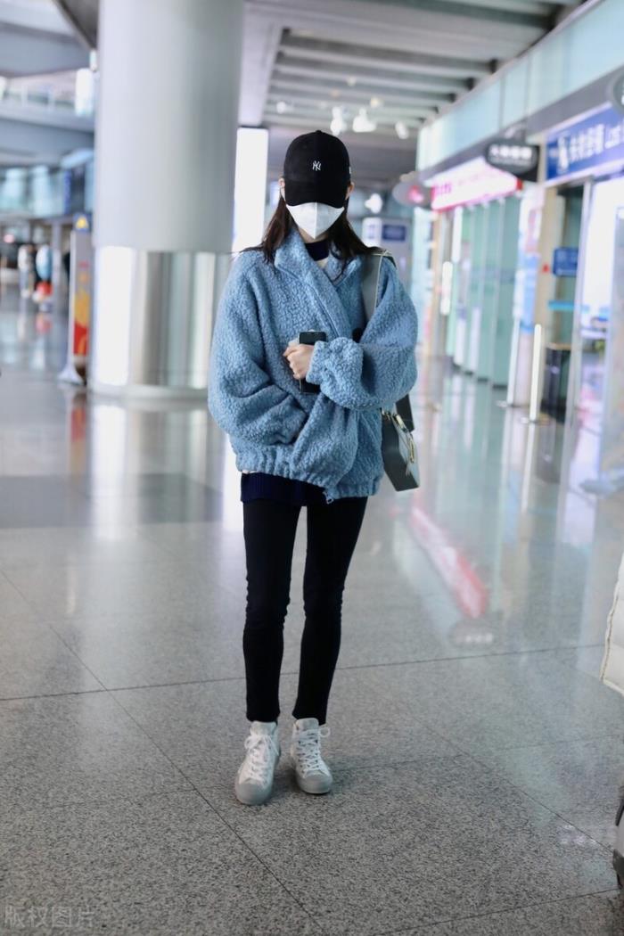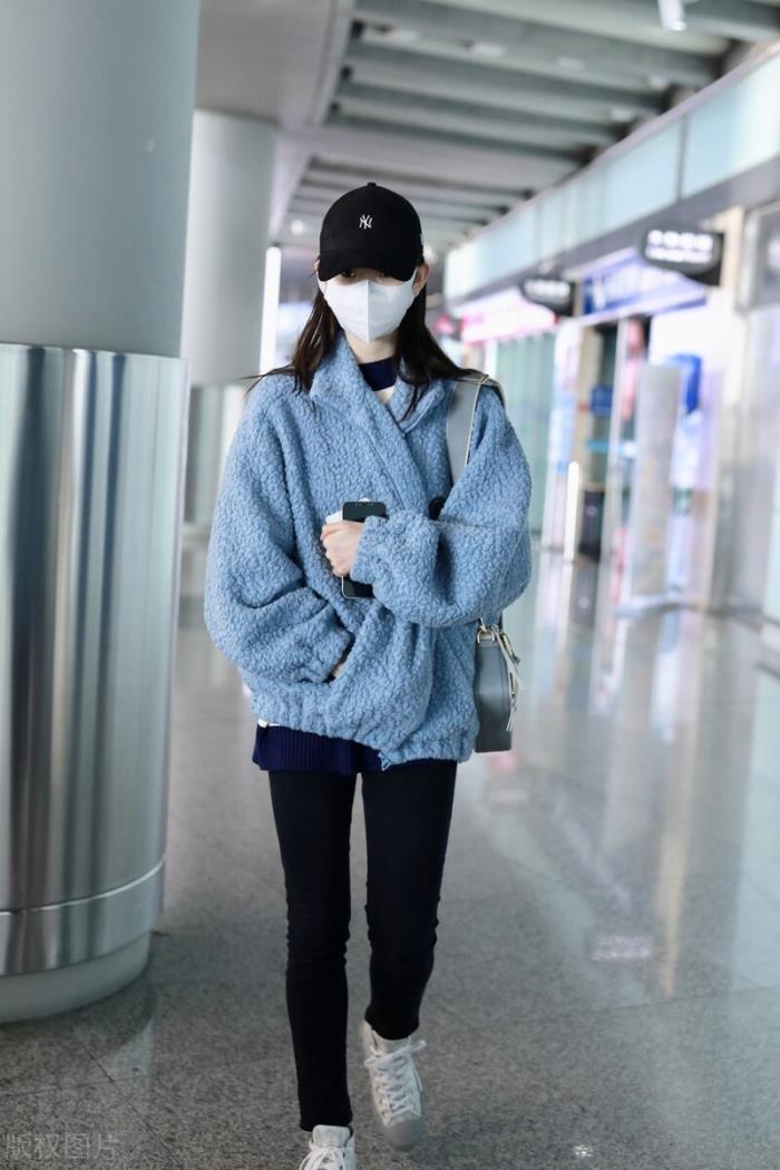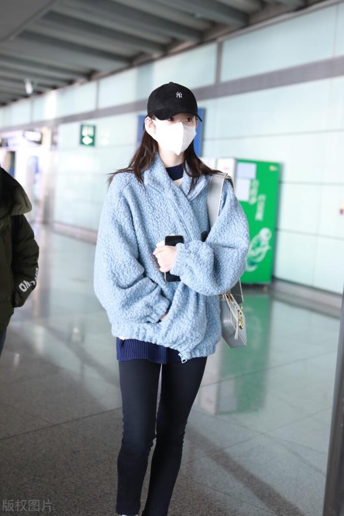 张艺凡穿蓝色摇粒绒搭配紧身裤现身,清新可人宝藏女孩。