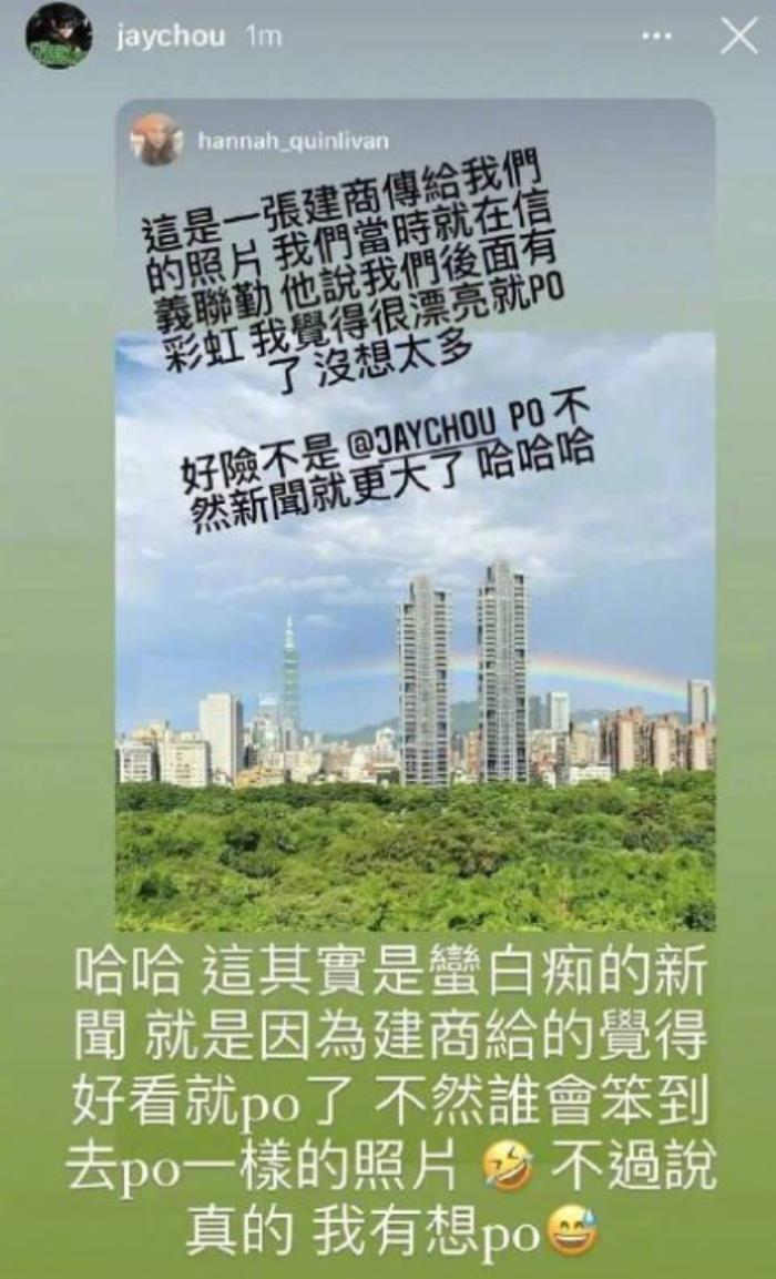 昆凌说,这是建商传来的图片,当时觉得好看就po了,还调侃到"幸好不是@JAYCHOU po,不然新闻就更大了"