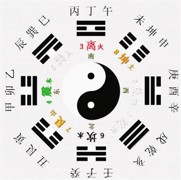 后天八卦图。上文已述,它代表的是后天入用之图,即按照文王意思所造之图。例如震代表东方,代表一年当中的春分,代表早上的六点,即所谓的卯时,代表五行当中的木,代表天干当中的甲乙,代表地支中的卯,代表人体的足。离代表南方,代表一年当中的夏至,代表上午的十二点午时,代表五行中的火,代表天干中的丙丁,代表地支中的午,代表人体的眼睛。兑代表西方,代表一年当中的秋分,代表下午六点酉时,代表天干当中的庚辛,代表五行当中的金,代表人体的口。坎代表西方,代表冬至,代表晚上十二点,子时。其余四卦可以类推。下图比较直观。需要强调两点,一是从应用八卦的角度而言,后天八卦图属于主流,应用较为广泛。二是在理解《周易》文本时,要以后天八卦图为准。例如坤卦“西南得朋,东北丧朋”,很明显,西南方是坤卦所处之位,东北方是乾卦所处之位,西南得朋,东北丧朋,则需按照此图来理解。