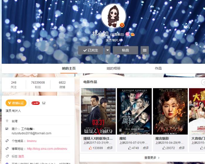 所以林心如的粉丝数量很多,高达七千多万,在明星中也是名列前茅的,难怪人气一直那么旺,她也很喜欢在微博分享动态,与圈内外朋友交流互动。