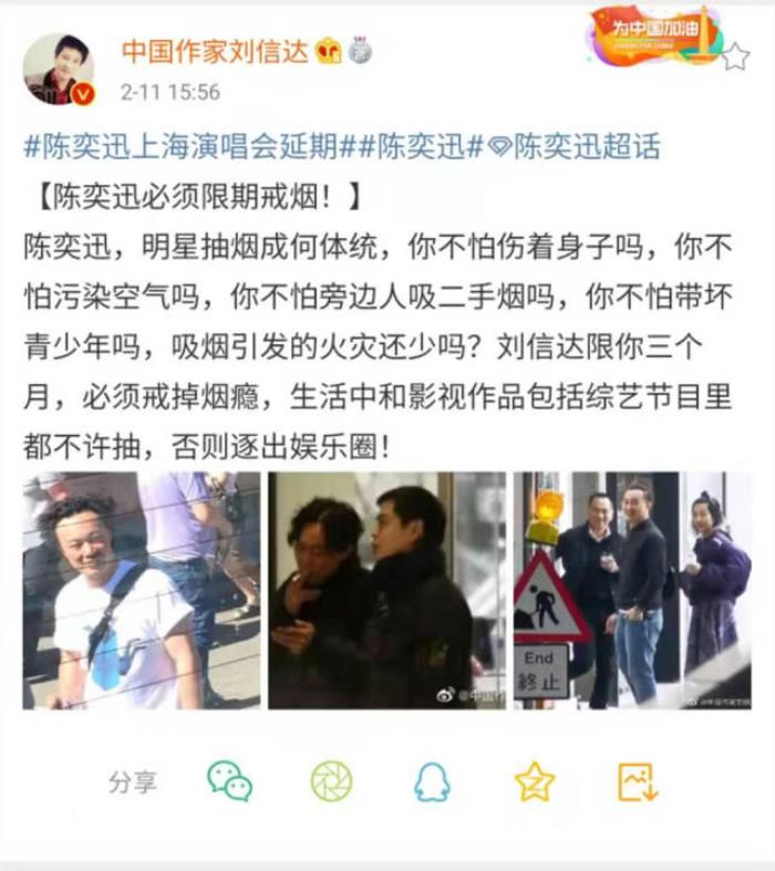 在娱乐圈中老烟民也是非常的多,很多明星都会抽烟,但是对于一位公众人物来说,这点的确会有一些不良的作用,而在现在的微博上,还有一位十分奇葩的人物,就是“知名作家刘信达”,对于明星的一些大事小事,都会选择去插上一脚,来博取眼球,这次就对于陈奕迅下手了!