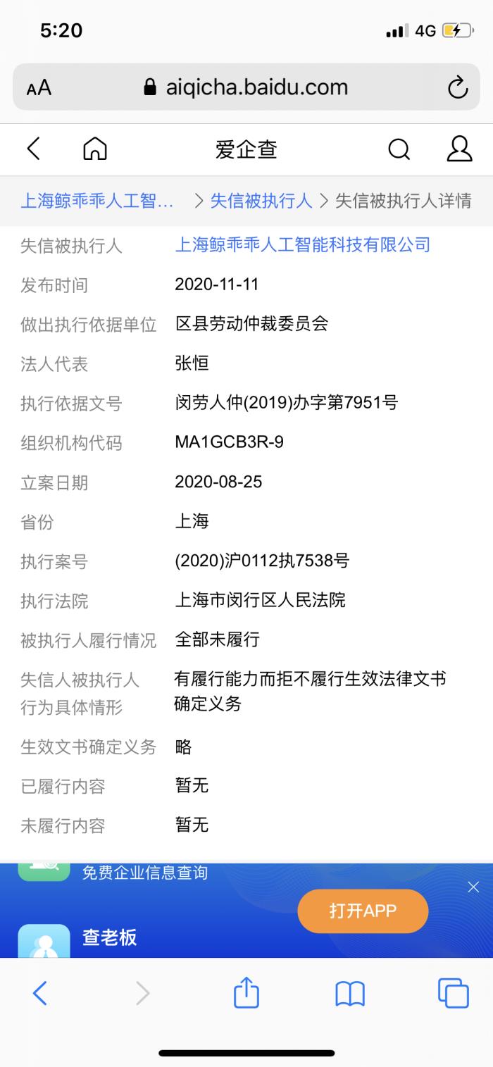 法院公告显示,从2020年6月开始,上海鲸乖乖人工智能科技有限公司涉多个劳动合同纠纷案件,原告诉请均与要求被告支付工资、加班费、解除劳动合同经济补偿等相关 ;2020年8月,鲸乖乖公司因未按时履行法律义务被法院强制执行;11月,该公司因为“有履行能力而拒不履行生效法律文书确定义务”,被法院列为失信被执行人。