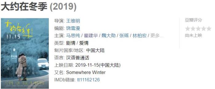 11月15日,改编自饶雪漫同名小说,由马思纯、霍建华、魏大勋等人主演的爱情电影《大约在冬季》上映,近期电影大盘正冷,难得有部新片上映,阵容、题材都还不错,按道理应该受到不小的关注,没想到从各项数据上看,电影热度实在不高。