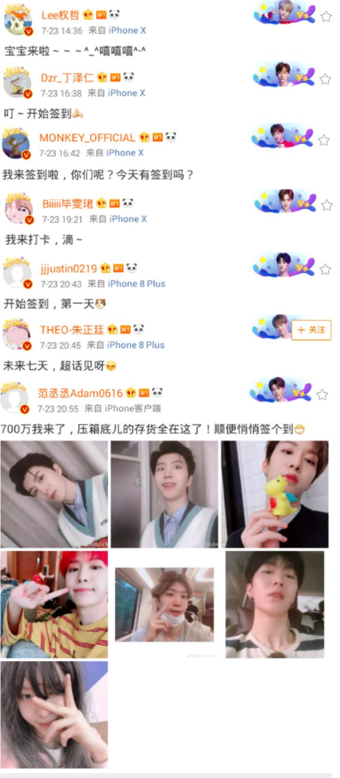 接下来朱正廷发的超话又让粉丝们疑惑起来:“未来七天,超话见呀。”怎么着?是有时限的吗?还七天?这是要干嘛呢?终于,有粉丝找到了答案解决了大家的疑惑:他们的举动恐怕和“粉丝嘉年华”活动有关,参与明星其中有一项“体验追星任务”。这几个人开始在自己的超话发贴、签到,原来还是为了完成任务。