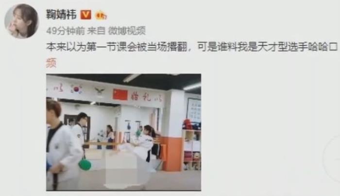 鞠婧祎还在微博上表示以为上跆拳道的第一节课就会被童鞋们打的鼻青脸肿呢?甚至会被童鞋们完全不顾形象的潦倒在地上呢?但是事实并不是鞠婧祎想的那样,鞠婧祎还调侃说自己是“天才型选手”,小编没有想到鞠婧祎还是一位自恋狂呢?但是练习跆拳道可不是一件很容易的事情啊,鞠婧祎在下方留言说自己练习了一天跆拳道,但是自己的腿却瘸了两天,走路都走不好了!下面网友的评论更是搞笑的很:说她瘸着瘸着就飞起来了!但是调侃归调侃,很多的网友表示关心,让她一定要照顾好自己,一定要多休息。