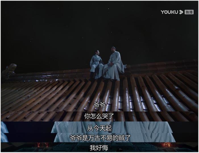 让我印象最深的是一场夜戏,朱棣和朱瞻基坐在屋顶上,朱棣感叹自己是“万古不易的贼”,光影投射过来,将人物笼罩在夜色的阴影里,但那种历史的悲凉之色已经穿过屏幕溢出来。