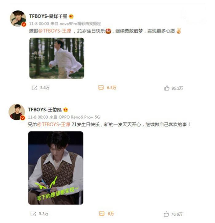 11月8日是王源21岁的生日,零点刚过,王俊凯、易烊千玺通过微博发文为其庆生。王俊凯写道:“兄弟21岁生日快乐,新的一岁天天开心,继续做自己喜欢的事!”易烊千玺则甜喊王源“源哥”,并送上生日祝福:“21岁生日快乐,继续勇敢追梦,实现更多心愿。”