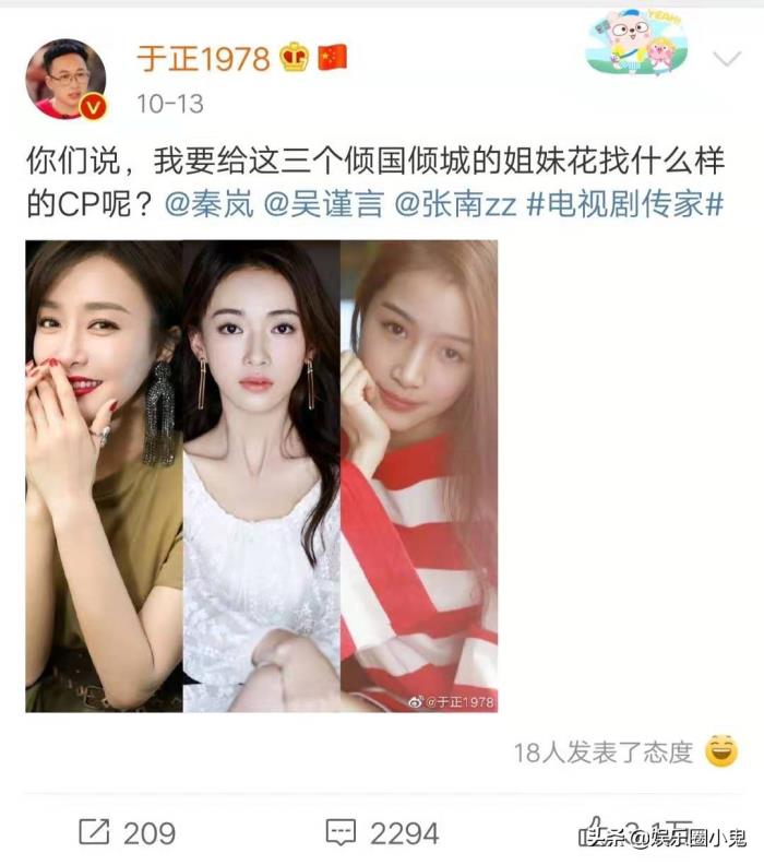这次于正全网在线给吴谨言,秦岚等角色配CP,网友也是很热心,秦岚配聂远,吴谨言配韩庚和茅子俊,张南配许凯,从于正曝光的照片来看,吴谨言又是稳站c位,秦岚和张南分别站两边,看来吴谨言又是女主角,秦岚再次给吴谨言作配。