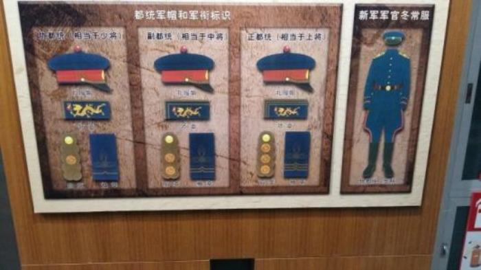 在这里展示的很多事物,都能看出这种过度性质。如,高级军官的大沿帽上竟然也缀着一颗不同颜色和质地的“顶戴”珠,只不过是没有“花翎”;有时干脆着西式军服,却带着“顶戴花翎”式的红缨帽,士兵的大沿帽下都垂着大辫子,甚是滑稽。其帽徽也是镶嵌着不同质地和颜色的“顶戴”珠。军官的礼服,甚是花哨,比起十九世纪西方军队军服有过之而无不及。
