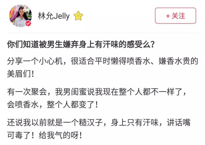 原来是自曝了之前不使用香水和香氛,被男闺蜜吐槽“身上只有汗味”。讲真,夏天不小心爆出汗味,简直就是我们仙女界的公开处刑……
