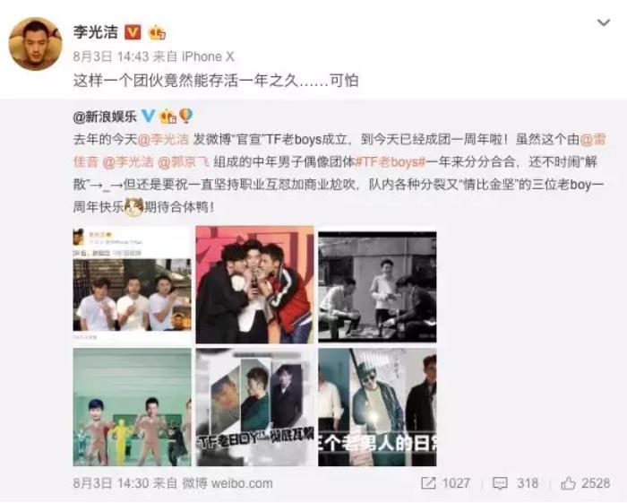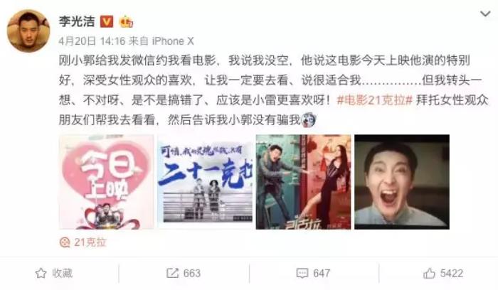 团建很随意,团灭靠心情,如此风雨飘摇的组合,“貌合神离”一起走过一年也是real不容易了。不过怼归怼,平时和睦时三人还是挺温情的。比如说成员有新作品,另外两位都会不遗余力帮替宣传,至于话风嘛~肯定是不走平常路的,李光洁给郭京飞新片《21克拉》打 call微博,是酱婶的⬇️
