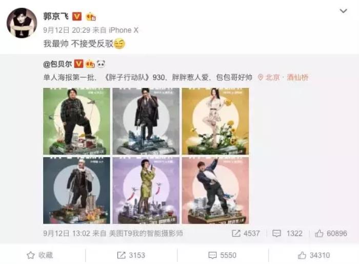 这不中秋国庆双节,郭京飞参演的《胖子行动队》即将上映,自己角色海报一出,郭京飞立刻在微博一如既往对盛世美颜展现傲娇自信。你们能忍,雷佳音、李光洁能忍吗?假铃姐相信这两位“塑料兄弟”已在怼天怼地怼郭京飞的路上开启飞奔。