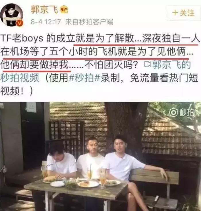 不吃素的郭京飞在微博上po出真相,说自己深夜独自一人在机场等了五个小时,就是为了见他俩,结果他俩竟然要把自己做掉,“解散得了”。