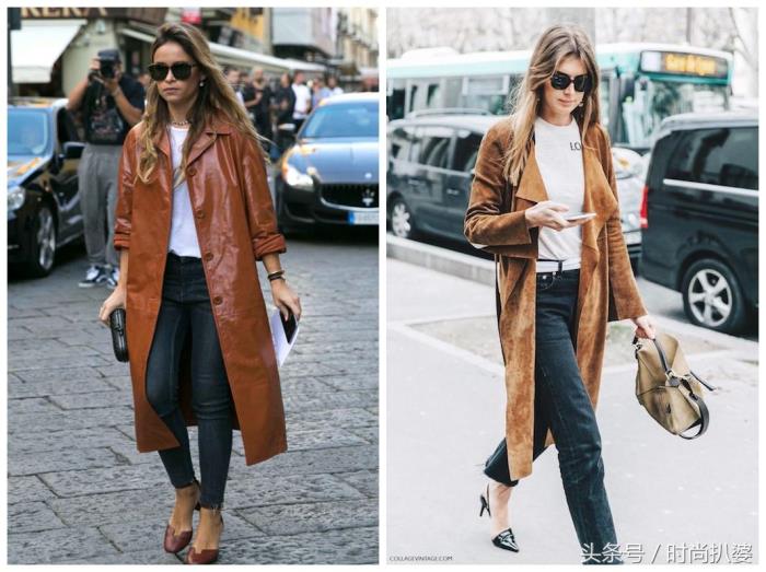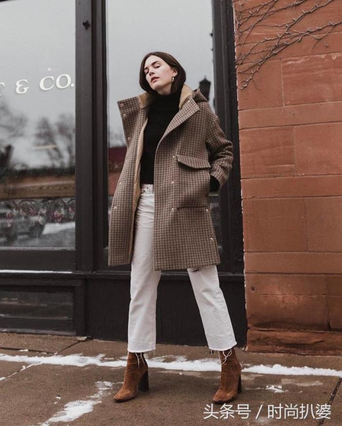 更时髦入流的搭配是内搭白色,下装九分复古牛仔裤,再加上今年超火的小白靴。简单,自带质感的三种颜色搭配在一起,有层次感,又非常养眼。(重点组合就是褐色与白色。)